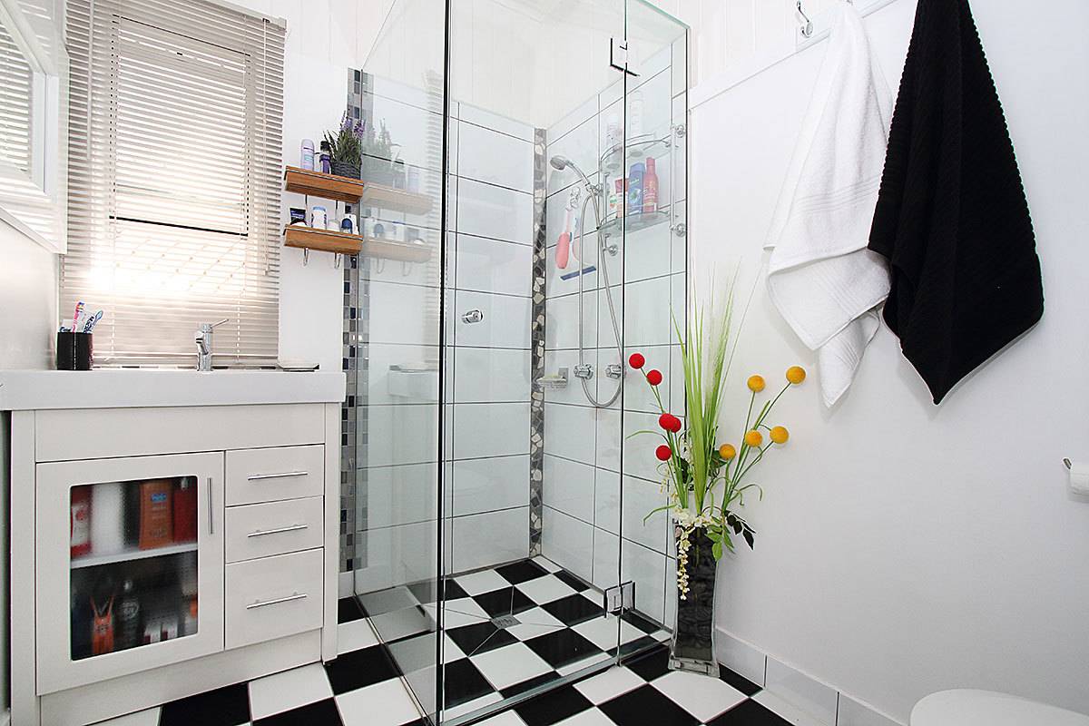The bathroom has had a make over and features chequer board floor which certainly adds some pizazz.