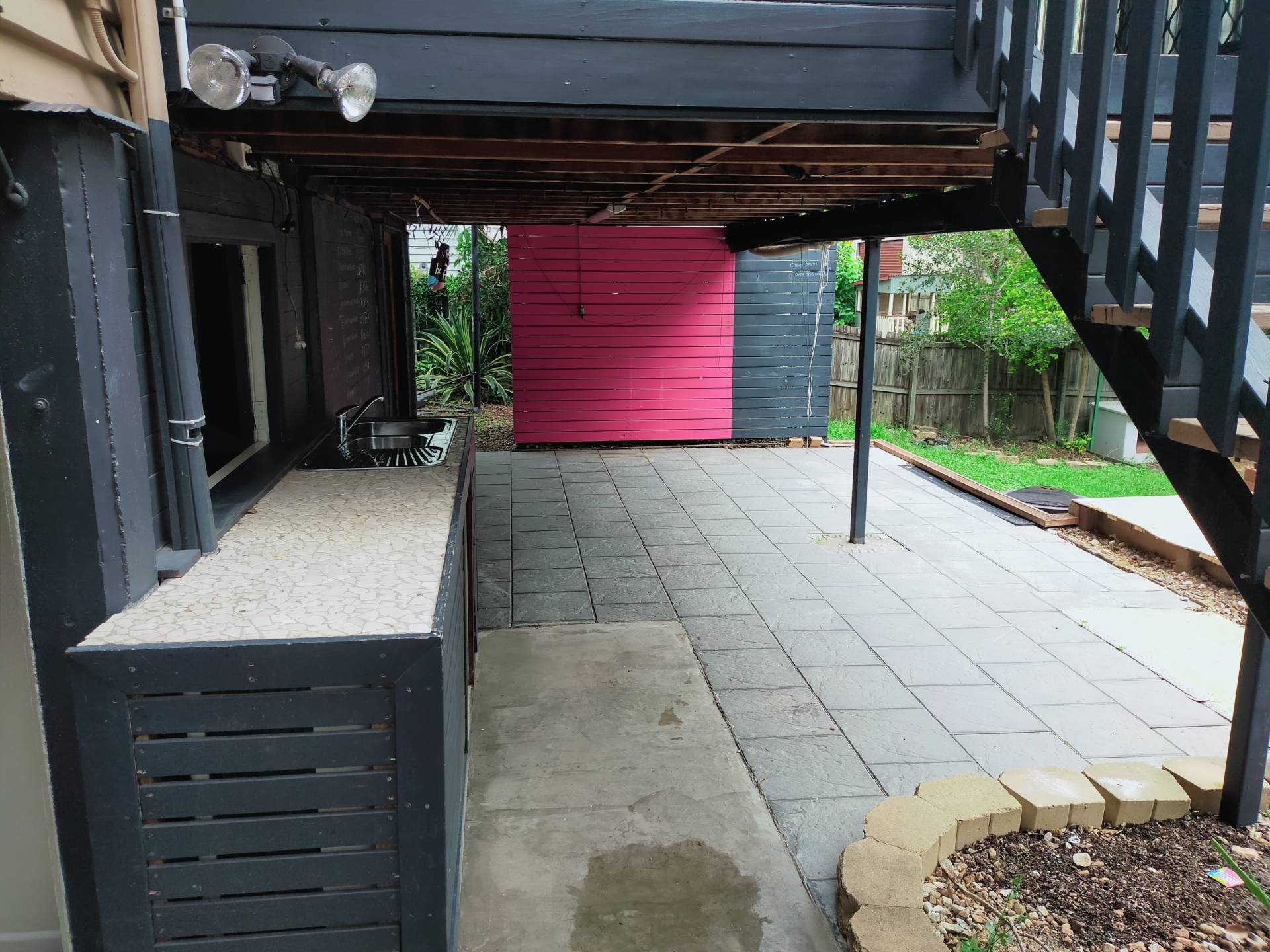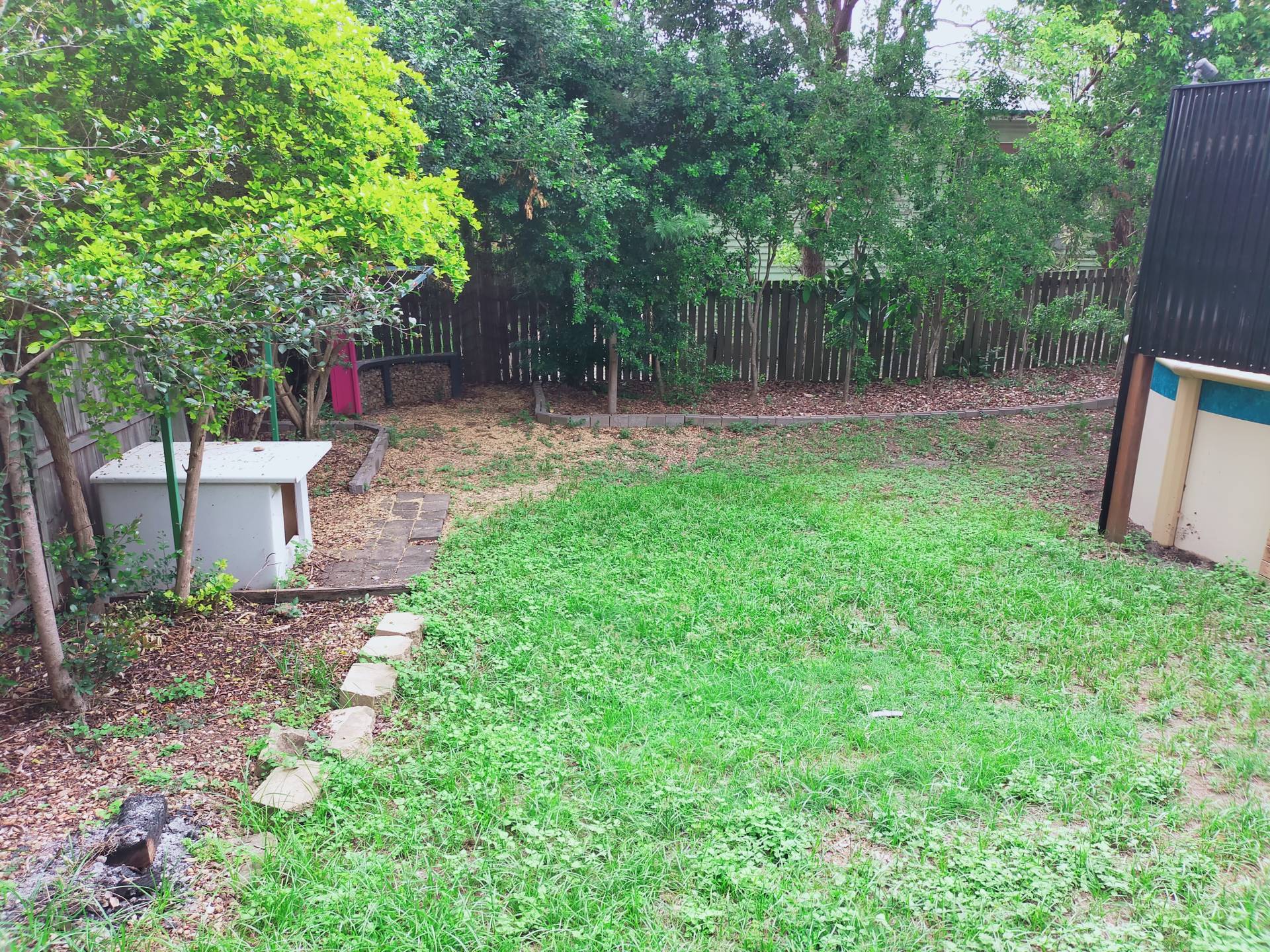 Gardens have a tropical feel including a fire pit and lockable storage.  The property is fenced in the rear yard and does offer space for kids to play.