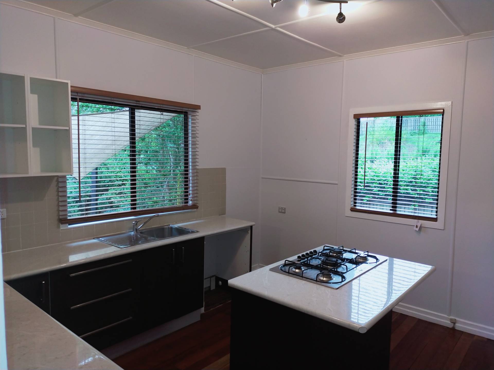 A modern kitchen with gas cooking located on the island bench, and an electric oven, plenty of cupboard and bench space plus a walk in pantry.   With double windows, the room is light and bright.