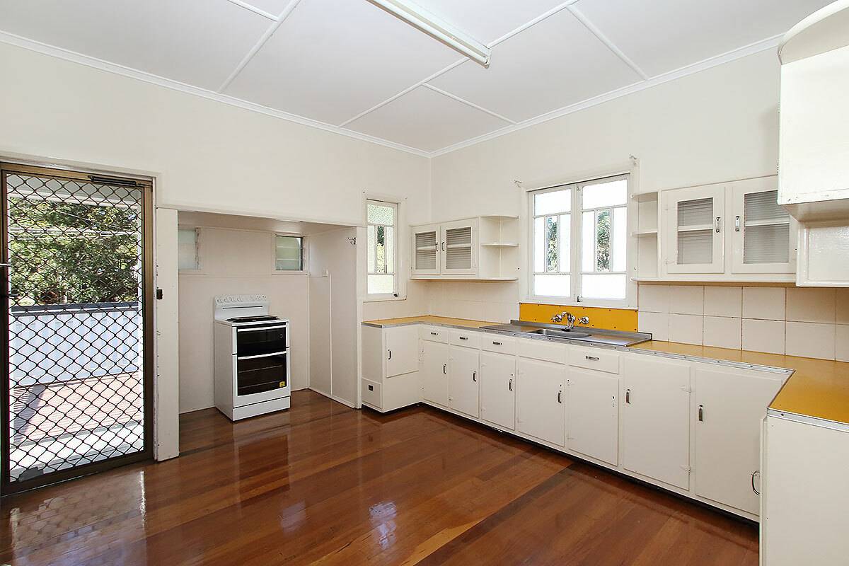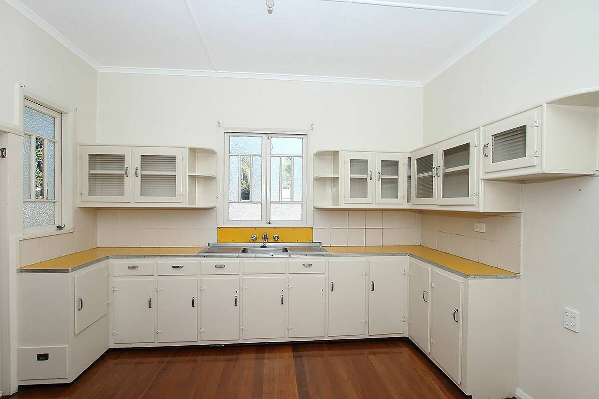 Through to the large eat in kitchen and you will find a lovely 1950's kitchen in great condition.  There is great space for a kitchen table and with easy access to a rear deck, entertaining is covered.