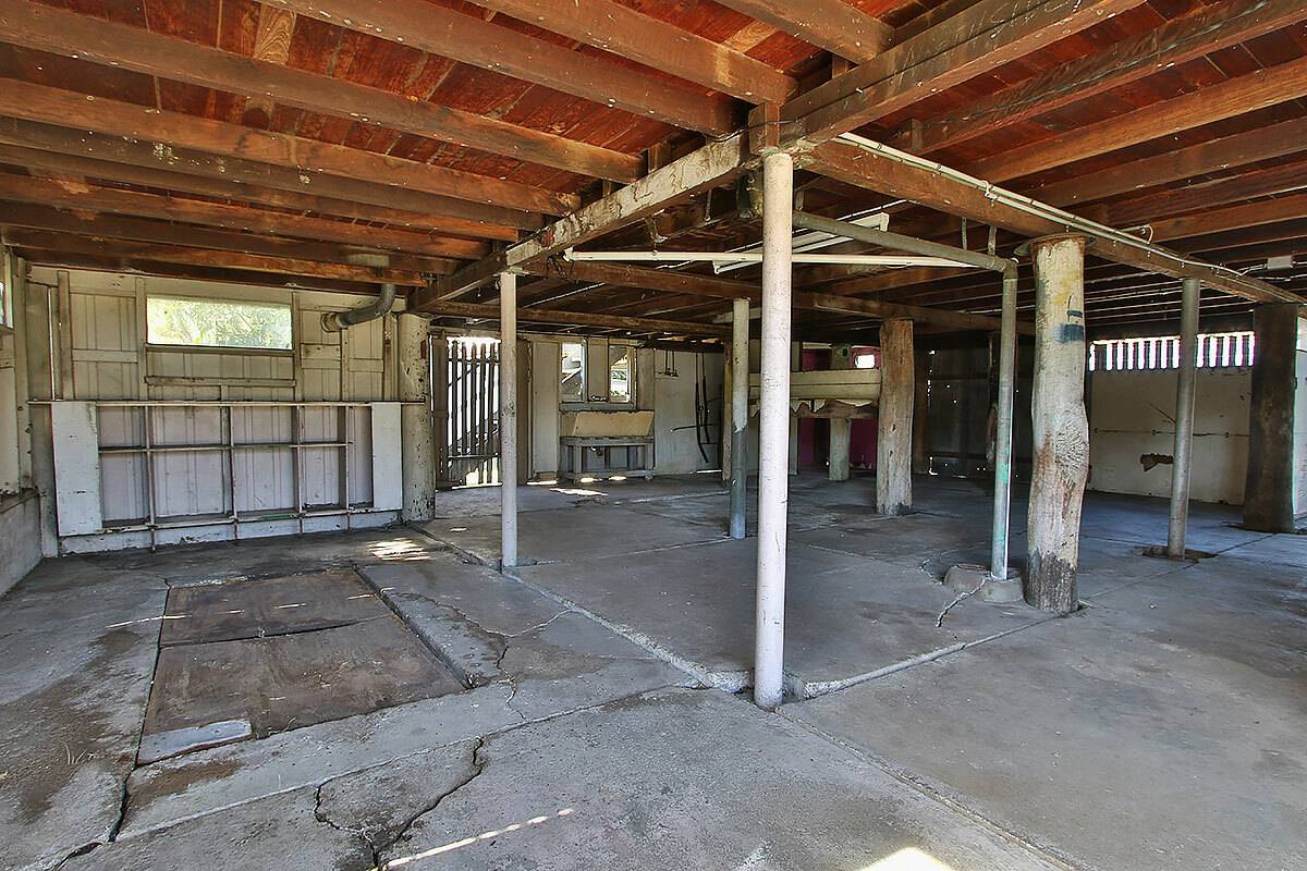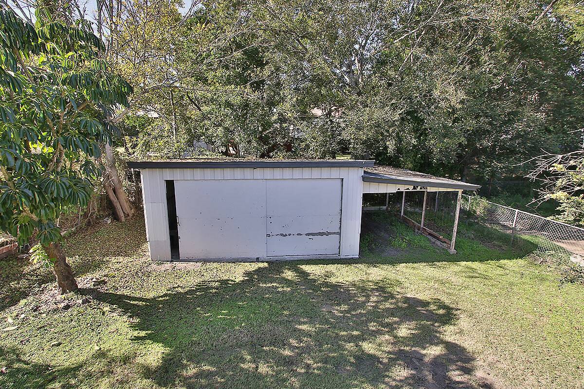 A back shed has double doors and a carport.