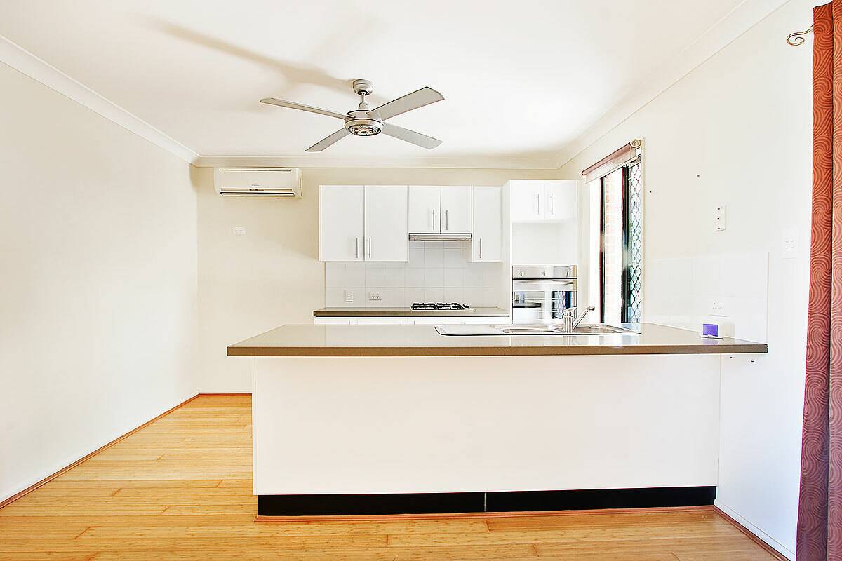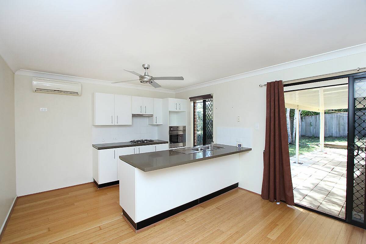 The open plan dining room adjoins the kitchen with plenty of space.  The kitchen offers a breakfast bar, gas cooking and dishwasher with easy access to the large covered entertainment area.  There is also great storage cupboards and access from the garage.