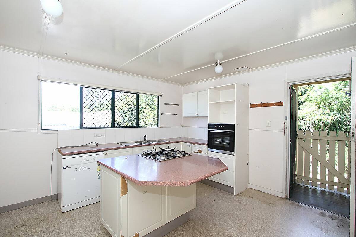 Adjacent is the kitchen with plenty of cupboard space, gas cooktop on the central island bench and electric oven.  There is an abundance of bench space and this space goes out to the rear covered entertaining area.  The wrap is coming off the kitchen in places, but the carcasses are still in pretty good condition.  Renovate or repair this area and you will reap rewards.