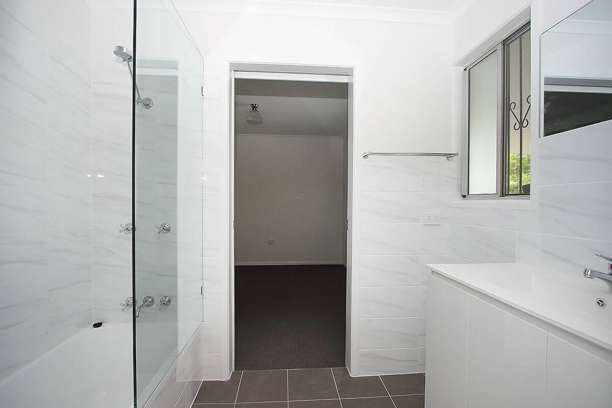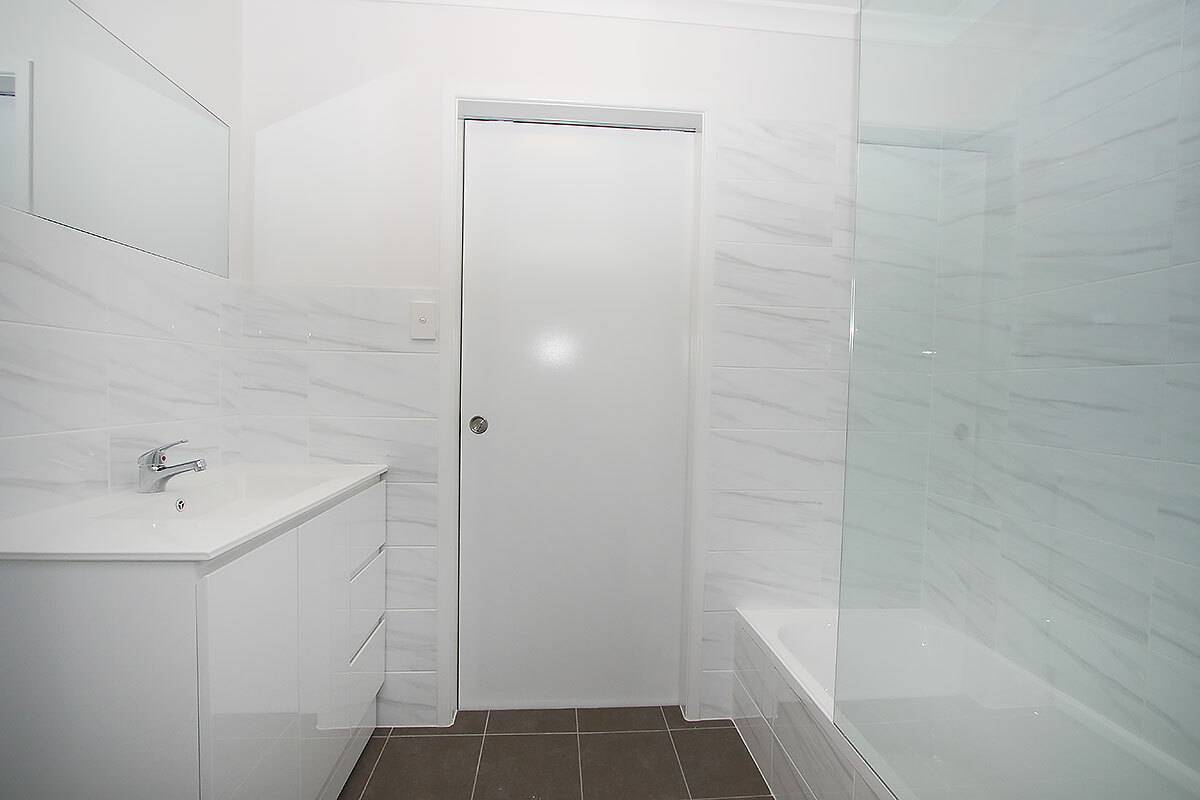 The bathroom is a natty two way bathroom with access from the master bedroom.  A shower over the bath with fixed glass panel and a decent sized vanity.  There is a separate toilet opposite with a laundry space as well.