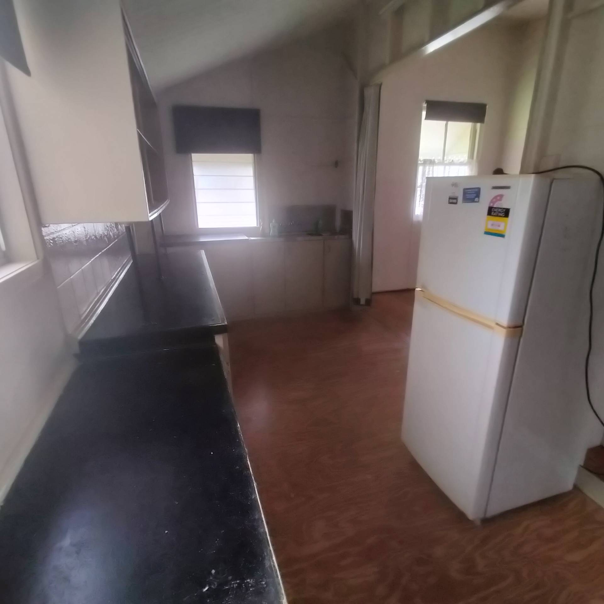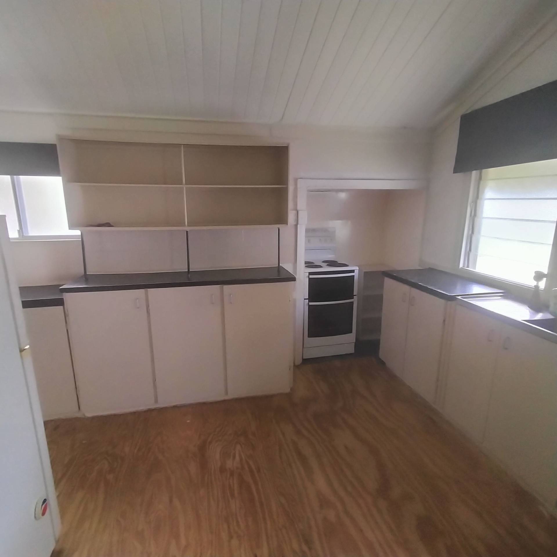 The kitchen has electric cooking and pretty good bench and cupboard space.