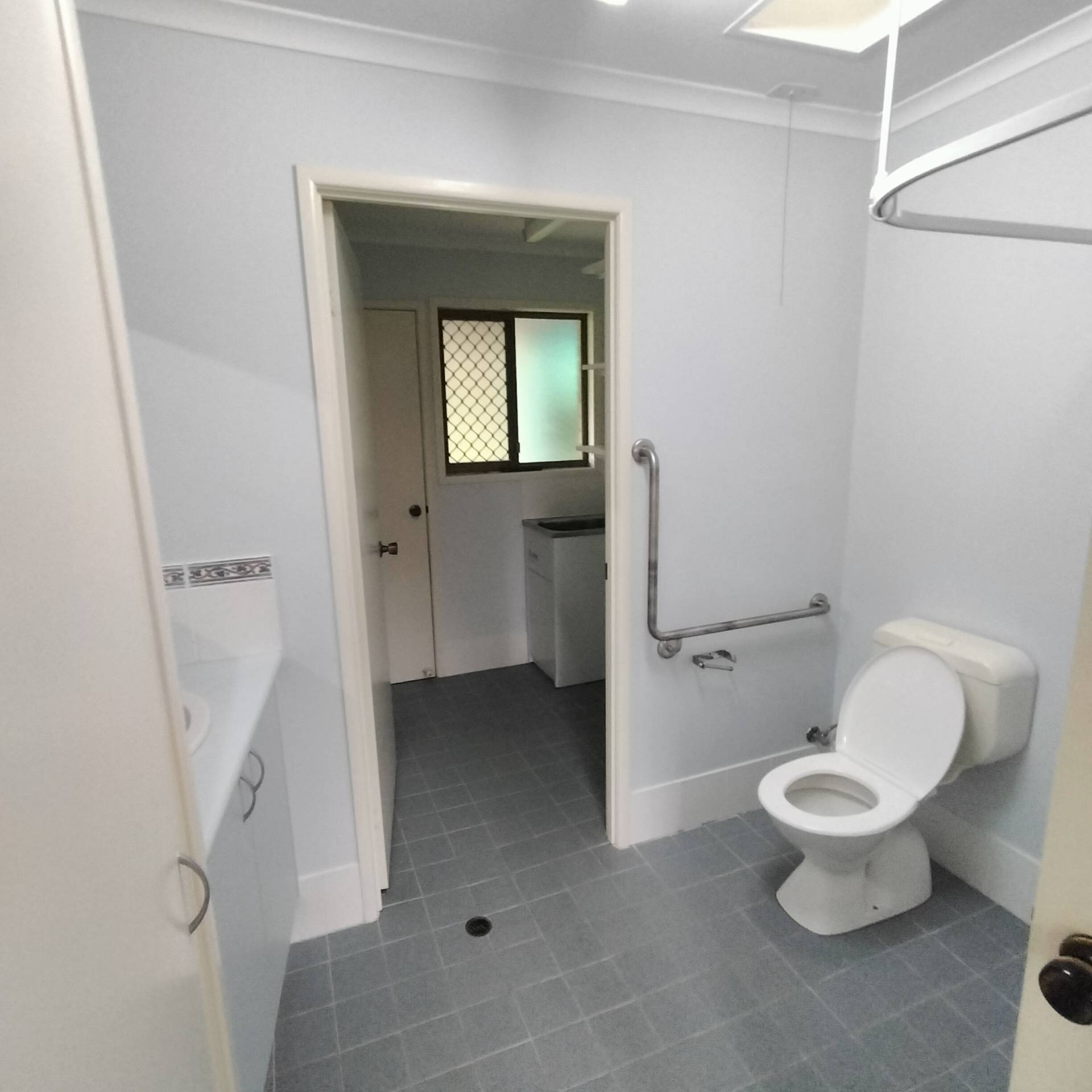 The bathroom features a walk in shower for ease, a decent sized vanity and cupboard, more storage and with grab rails in place at shower and toilet.