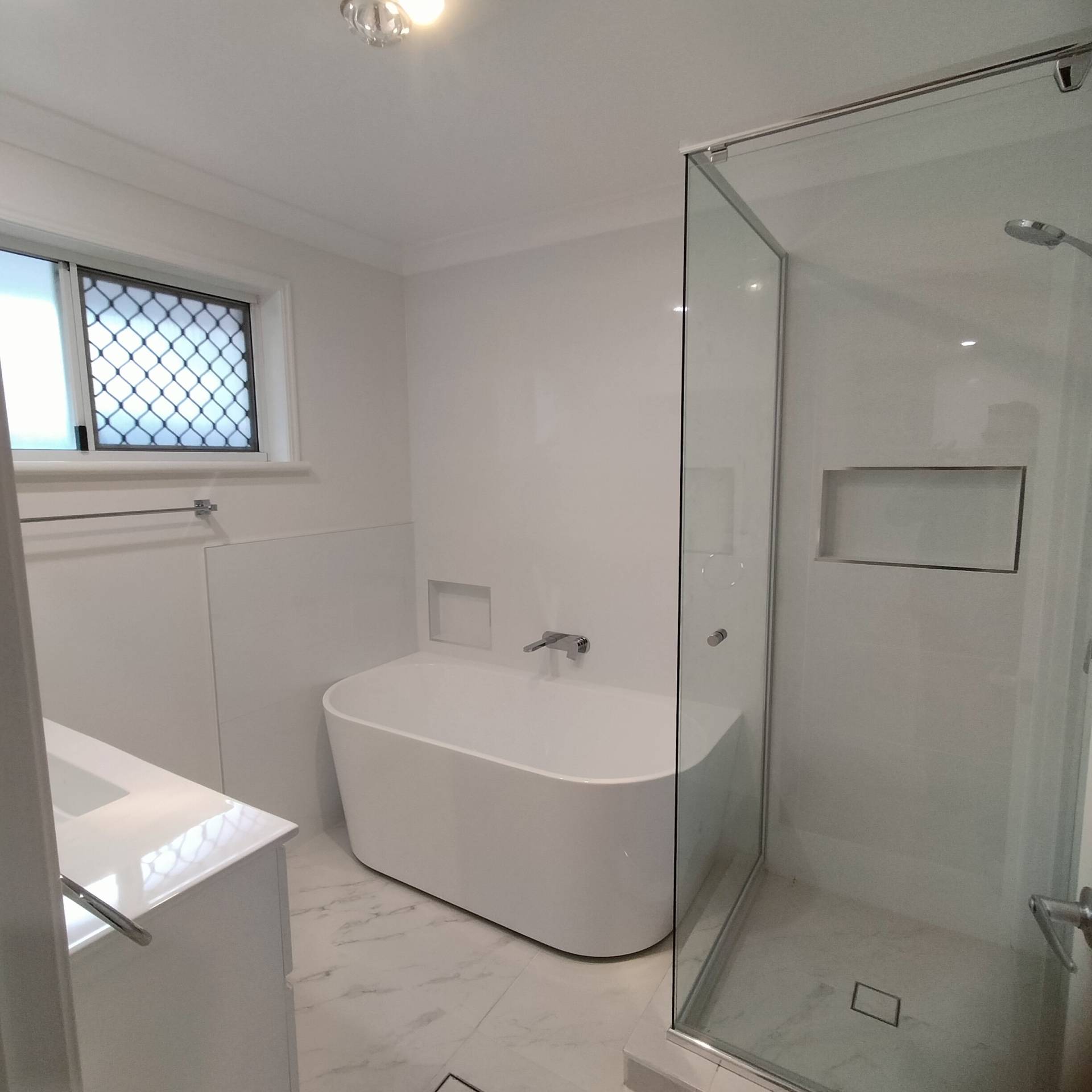 Bathroom has separate shower and bath, and separate toilet