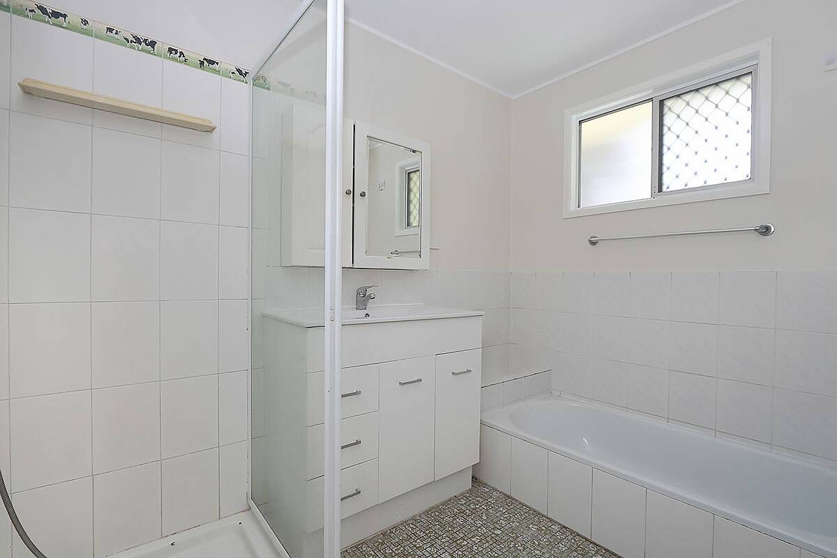 The home features three well-proportioned bedrooms, two of which come with built-in robes, providing plenty of storage. A family bathroom with a separate shower and bath, along with a separate toilet, ensures comfort and convenience for all members of the household. A double-door linen cupboard in the hallway adds even more practical storage.