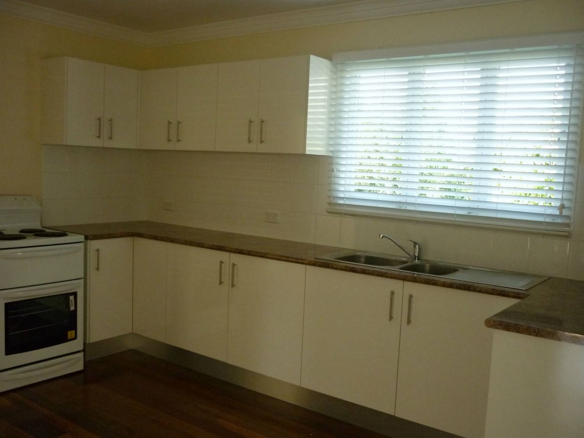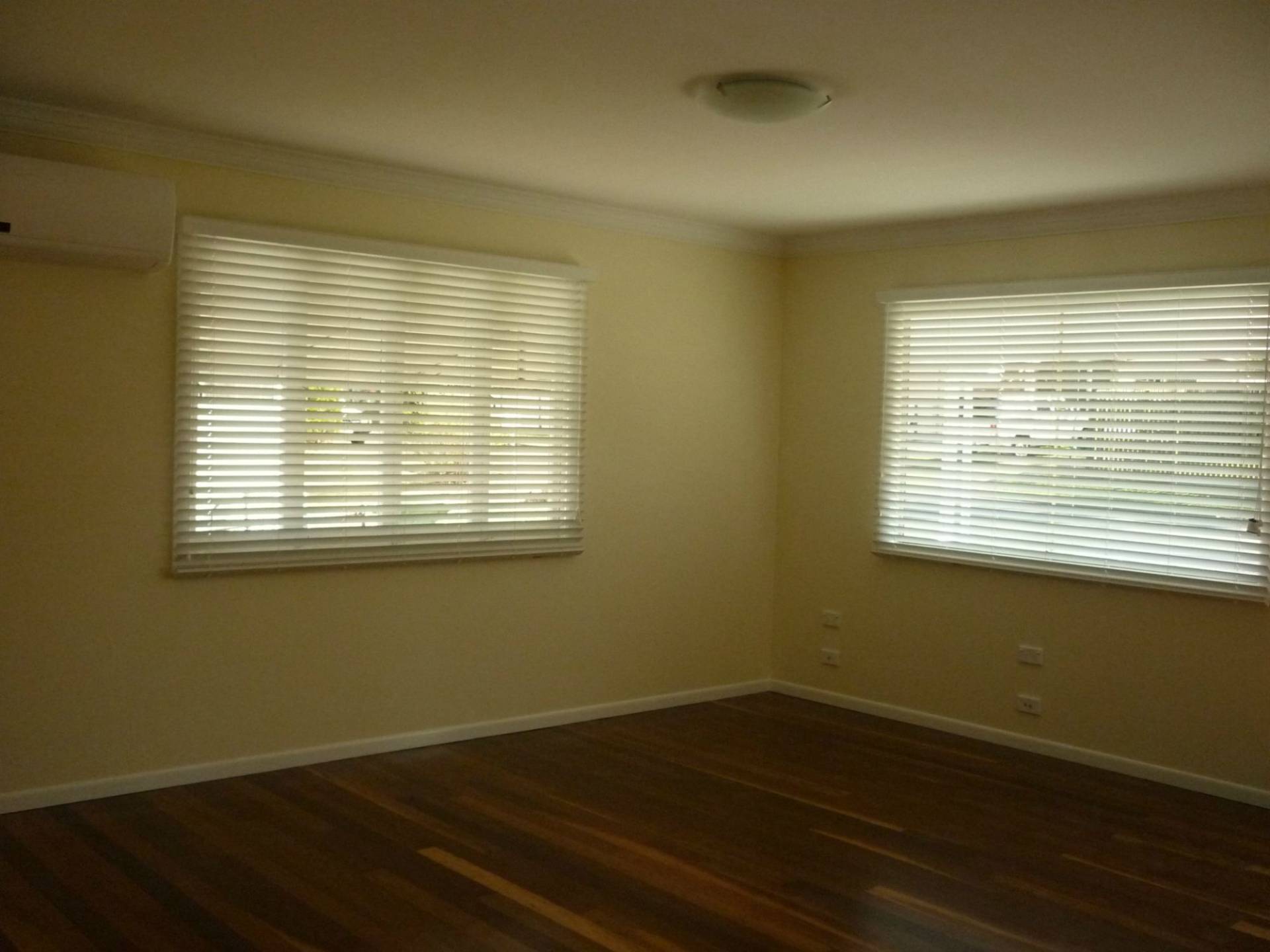 - Open plan kitchen, dining, lounge that has a large air conditioner