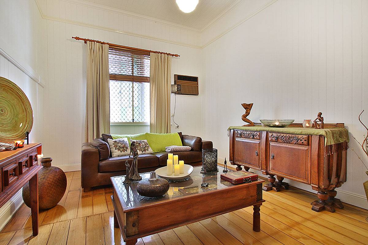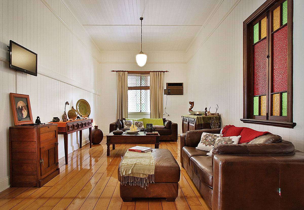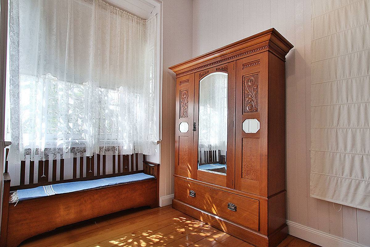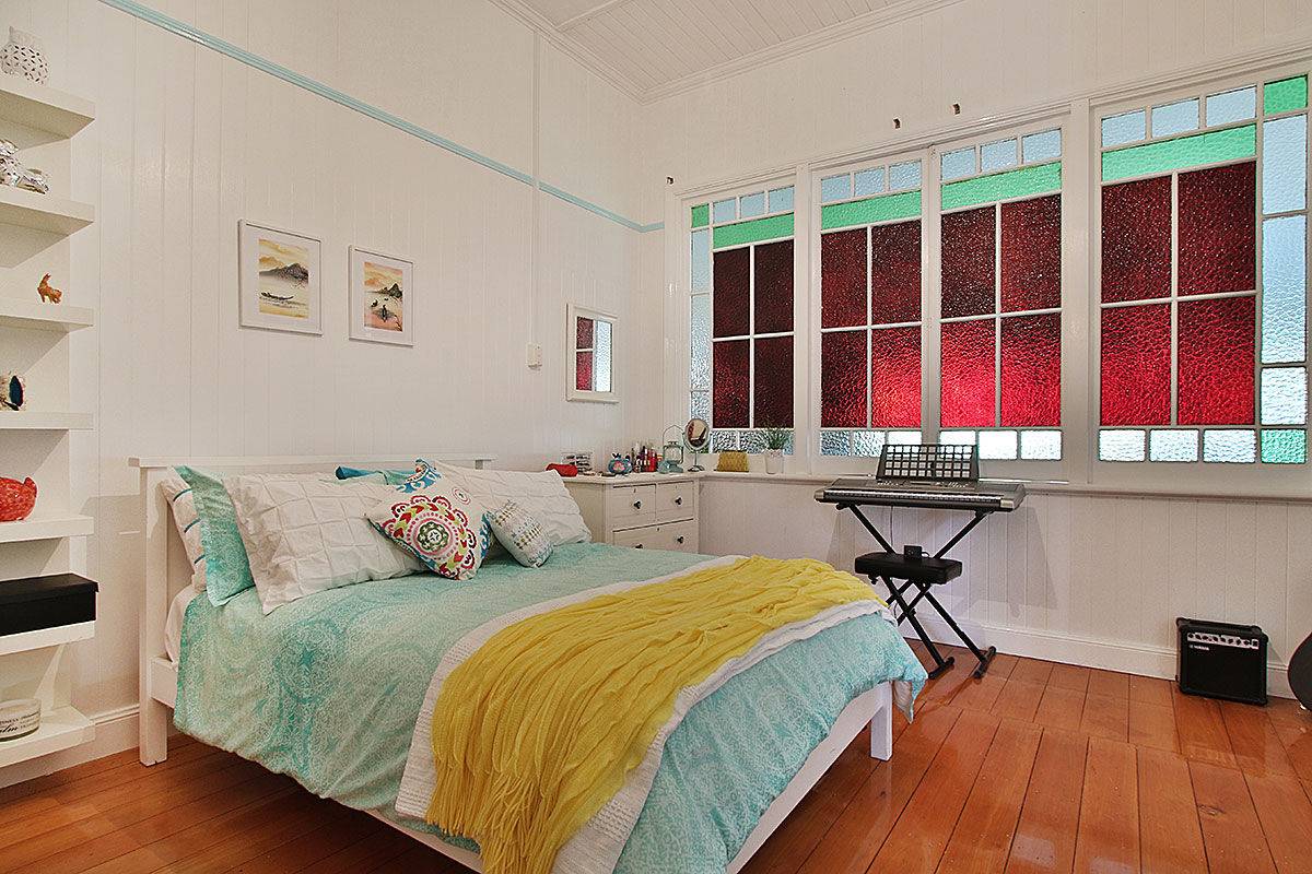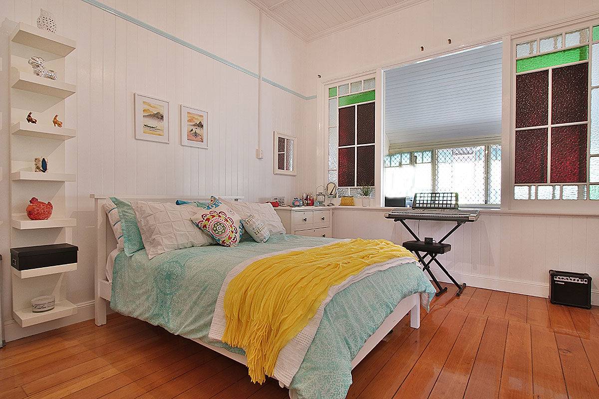 From the generous front entry that features Leadlighting, there is the master bedroom. This is a very large room with built-ins and space for several pieces of furniture and features beautiful large windows. The guest room is just as large with a magnificent feature of beautiful Ruby glass windows that open out onto the sleepout and office space. This bedroom also has a built-in robe. The homes has polished timber floors throughout.